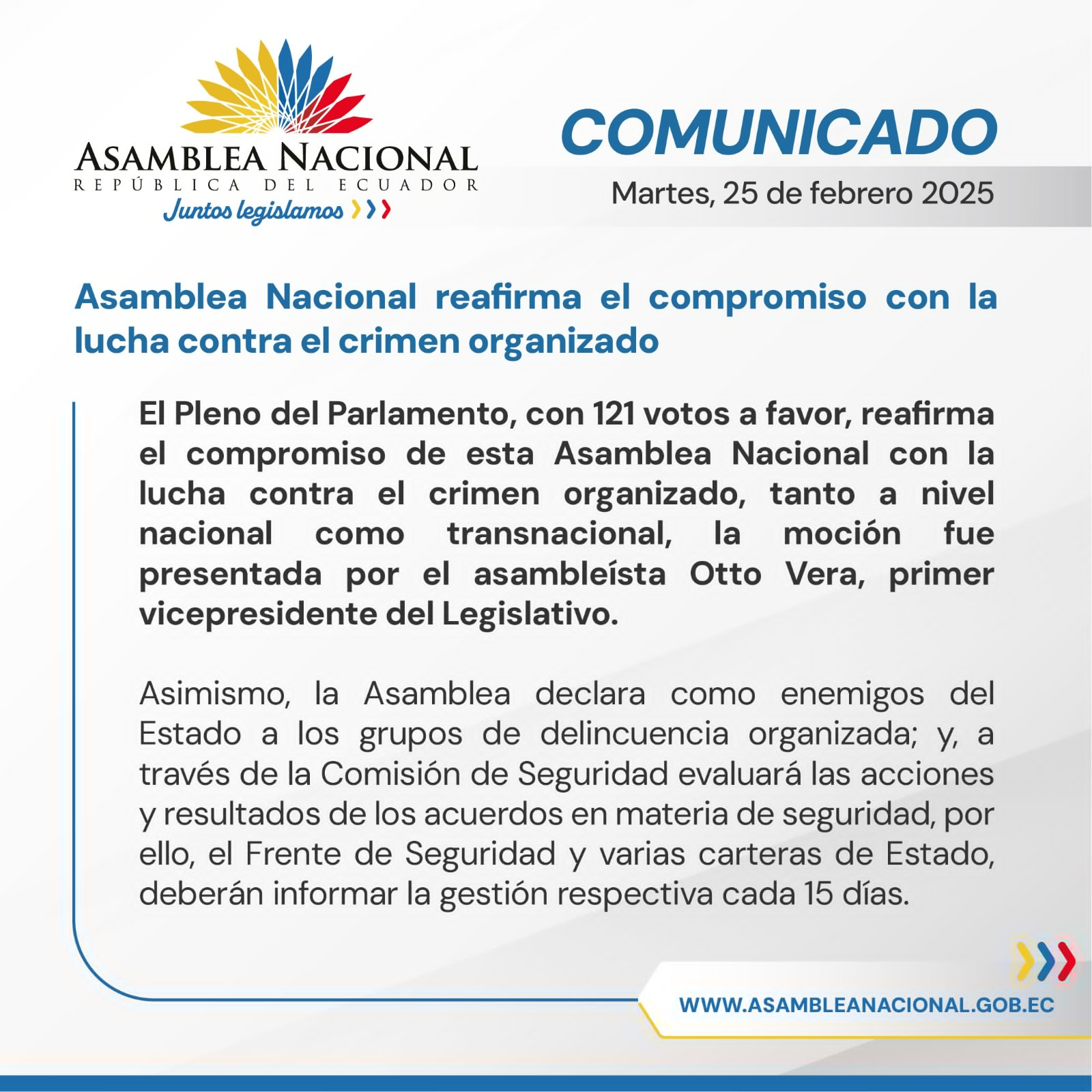 El incremento de la violencia en Ecuador, con más de 1.000 homicidios registrados entre enero y febrero de 2025, ha llevado a la Legislatura a priorizar estrategias de seguridad y cooperación interinstitucional. En este marco, la resolución presentada por el asambleísta socialcristiano Otto Vera fue debatida y finalmente aprobada.