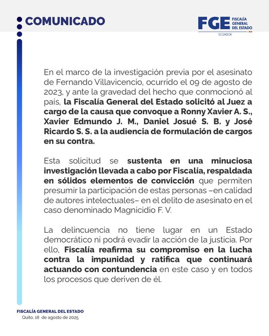 La Fiscalía General del Estado, bajo la dirección de la fiscal Ana Hidalgo, solicitó a un juez que cite a Ronny Aleaga, Xavier Jordán, Daniel Salcedo y José Serrano a la audiencia de formulación de cargos por su presunta participación como autores intelectuales del asesinato de Fernando Villavicencio. Este caso, identificado por el Ministerio Público como Magnicidio FV, cuenta con un logotipo oficial para su seguimiento y comunicación.