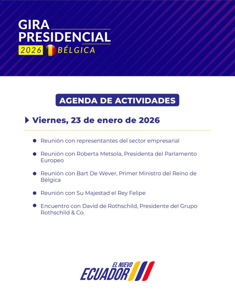La gira internacional del presidente Daniel Noboa entra en su recta final. Este viernes 23 de enero, el mandatario ecuatoriano inició su agenda oficial en Bélgica, última escala de su recorrido por Europa, con una serie de reuniones clave orientadas a fortalecer la relación económica y política entre Ecuador y la Unión Europea.
