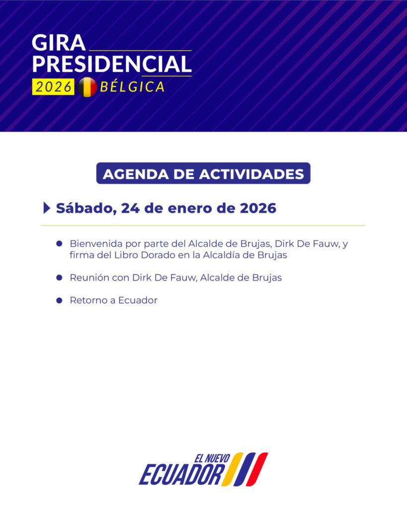 El sábado 24 de enero, el mandatario será recibido por el alcalde de Brujas, Dirk De Fauw, donde firmará el Libro Dorado, un acto protocolario reservado para visitas oficiales de alto nivel. Ese mismo día, Noboa emprenderá su retorno a Ecuador, dando por concluida una gira que inició el 19 de enero en Suiza, con su participación en el Foro Económico Mundial de Davos.
