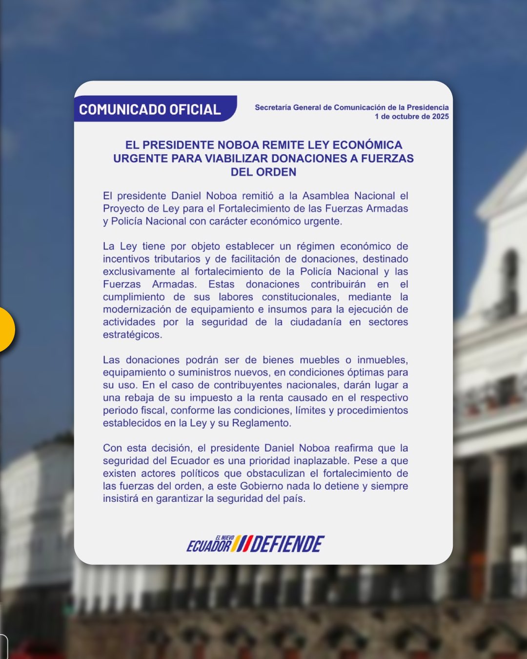 El presidente Daniel Noboa envió a la Asamblea una ley económica urgente para fortalecer a la Policía y las Fuerzas Armadas, con incentivos tributarios y facilidades para donaciones nacionales e internacionales.