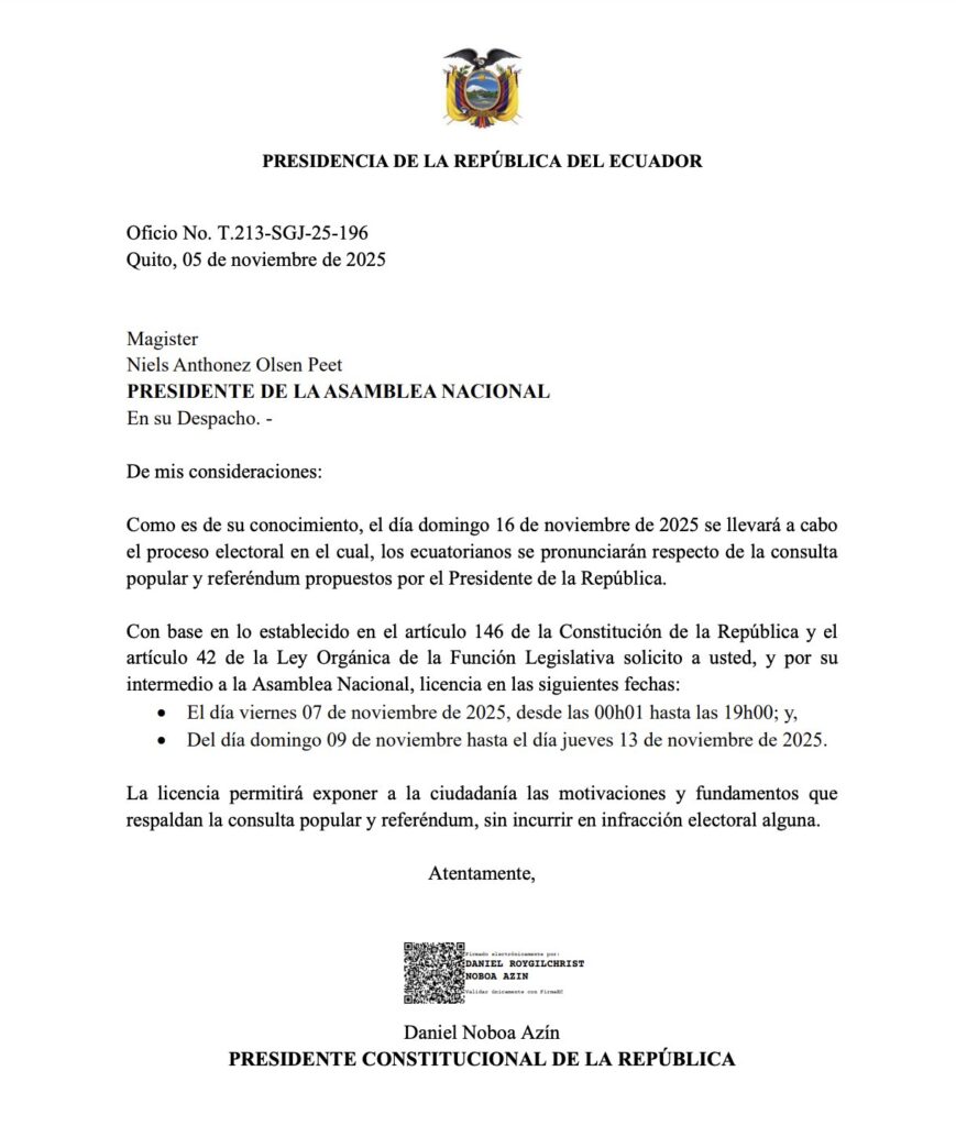 El presidente Daniel Noboa ha solicitado oficialmente a la Asamblea Nacional una licencia temporal para sumarse de forma activa a la campaña por el “Sí” en la consulta popular y referéndum 2025, cuyo proceso electoral se desarrolla durante noviembre.