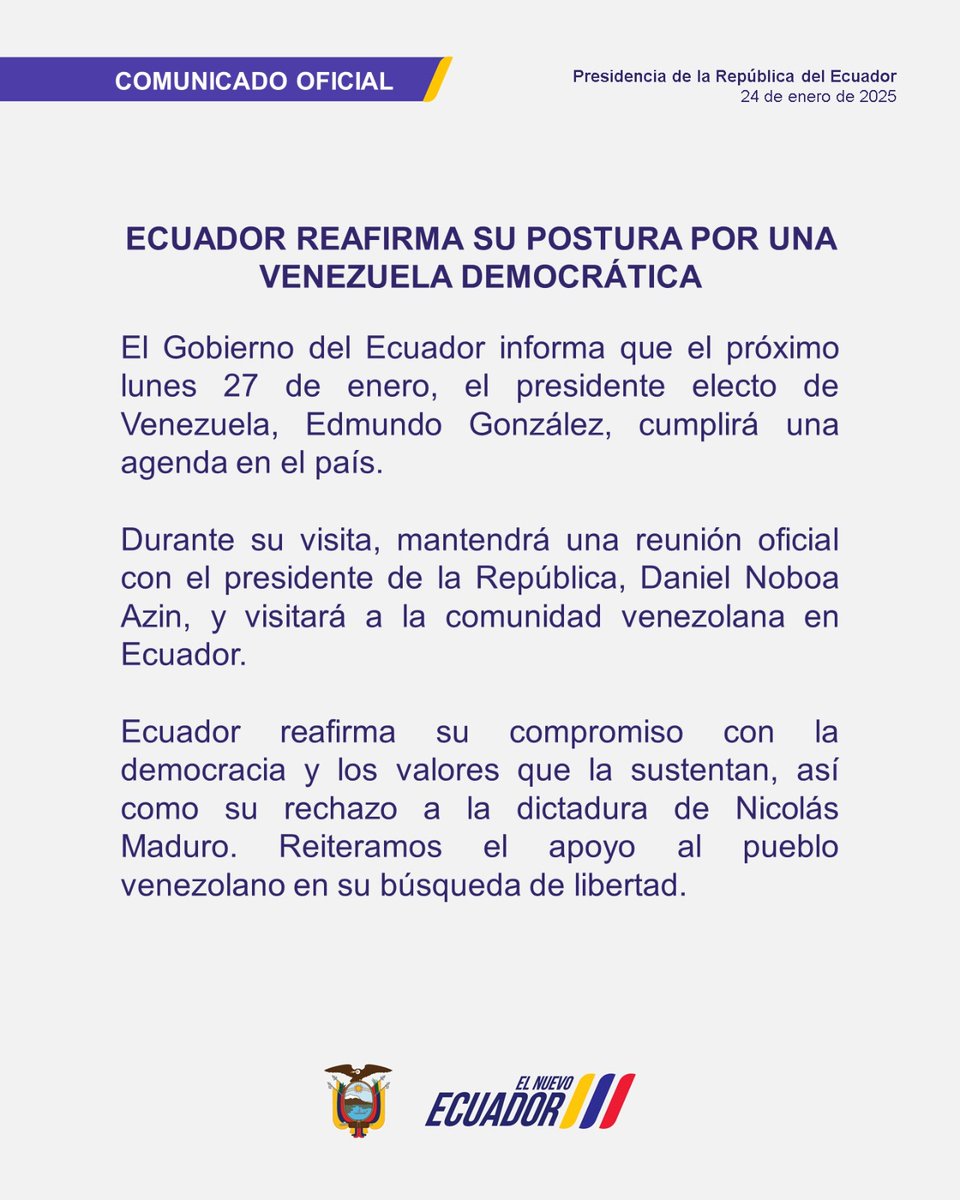 El próximo lunes 27 de enero de 2025, el presidente de Venezuela reconocido por varios países, Edmundo González Urrutia, llegará a Ecuador para cumplir una agenda oficial que incluirá una reunión en el Palacio de Carondelet con el presidente ecuatoriano, Daniel Noboa Azín.