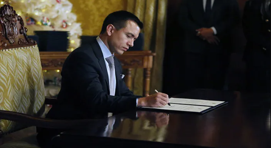Esta decisión se formalizó a través del decreto ejecutivo no. 29 durante el segundo día de Noboa en la presidencia. Aunque el documento no detalla las razones detrás de esta medida, establece que el gobierno está «Comprometido con la prestación de servicios y la dotación de obra pública de calidad».