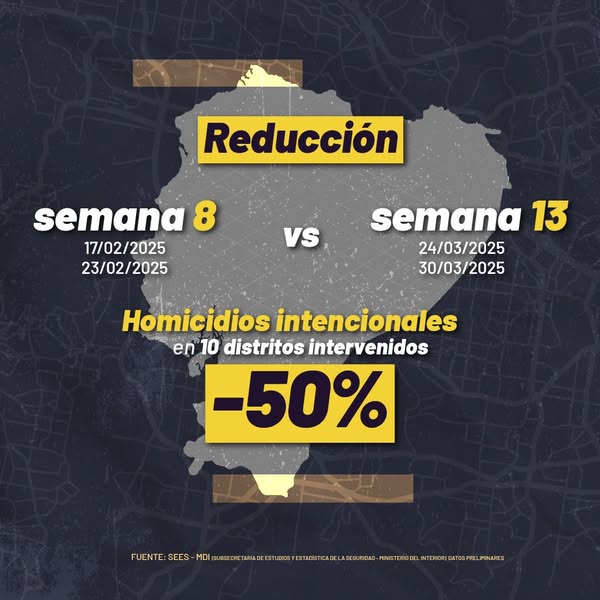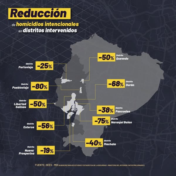 𝐋𝐀 𝐋𝐔𝐂𝐇𝐀 𝐂𝐎𝐍𝐓𝐑𝐀 𝐄𝐋 𝐂𝐑𝐈𝐌𝐄𝐍 𝐎𝐑𝐆𝐀𝐍𝐈𝐙𝐀𝐃𝐎 𝐂𝐎𝐍𝐓𝐈𝐍Ú𝐀 y los resultados ya son visibles. Según datos oficiales, entre el 17 de febrero y el 30 de marzo de 2025, los homicidios intencionales se redujeron en un 50% en 10 distritos priorizados ubicados en las provincias de Guayas, Manabí, El Oro y Los Ríos. Esta drástica disminución evidencia el efecto positivo de una intervención estratégica y coordinada por parte de las fuerzas de seguridad del Estado.