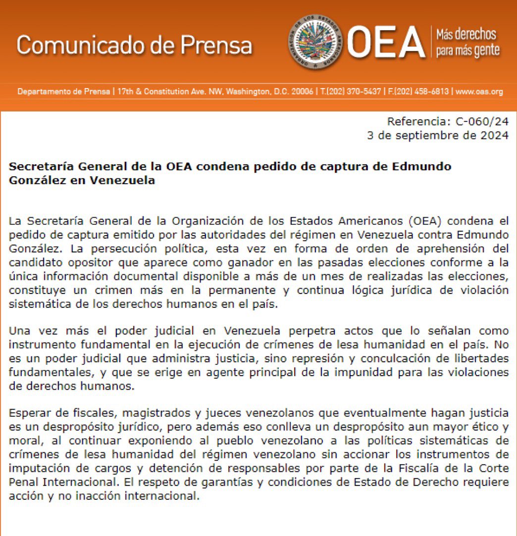 La Secretaría General de la OEA ha condenado enérgicamente la reciente orden de captura emitida por el régimen en Venezuela contra Edmundo González, el presidente electo. La OEA ha calificado esta persecución política como un grave crimen que se suma a la continua violación sistemática de los derechos humanos en el país.