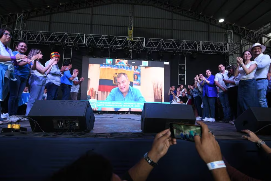Posteriormente, a través de una videoconferencia, se pidió silencio para escuchar una intervención de Rafael Correa, quien reside en Bélgica. Aunque su mensaje no fue del todo comprensible debido al eco y los murmullos de los militantes, en pantallas gigantes se le veía con una bandera del Ecuador detrás y pósters de González.