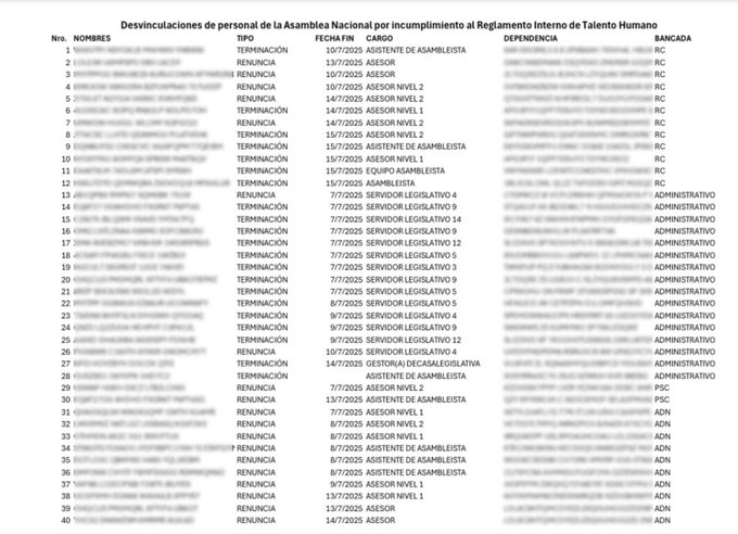 Este «ajuste interno» responde a la reforma del reglamento de Talento Humano impulsada por el propio Olsen, que prohíbe a los familiares de los legisladores trabajar en la misma institución. «Estamos limpiando la Asamblea», aseguró el titular del Legislativo.