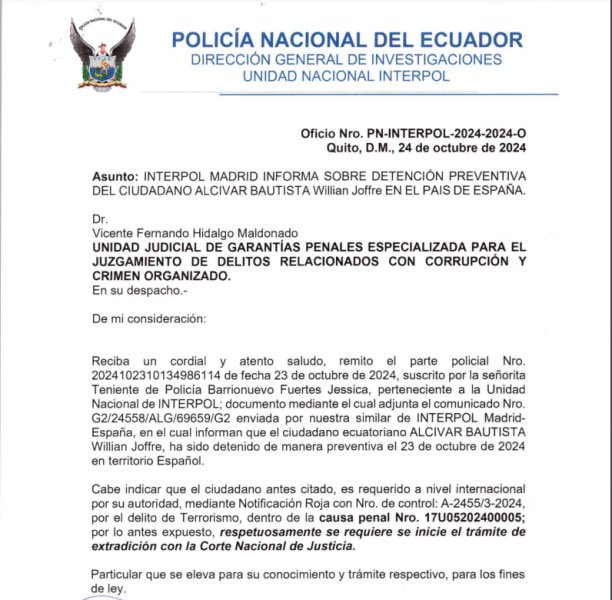 Un mes después de la detención de alias Negro Willy, cabecilla de Los Tiguerones, en España, la Corte Nacional de Justicia envió oficialmente el 21 de noviembre de 2024 la solicitud de extradición a las autoridades españolas. El documento fue emitido a las 10:30 y también incluyó la solicitud de extradición de su hermano Alex Alcívar Bautista, conocido como alias Ronco.