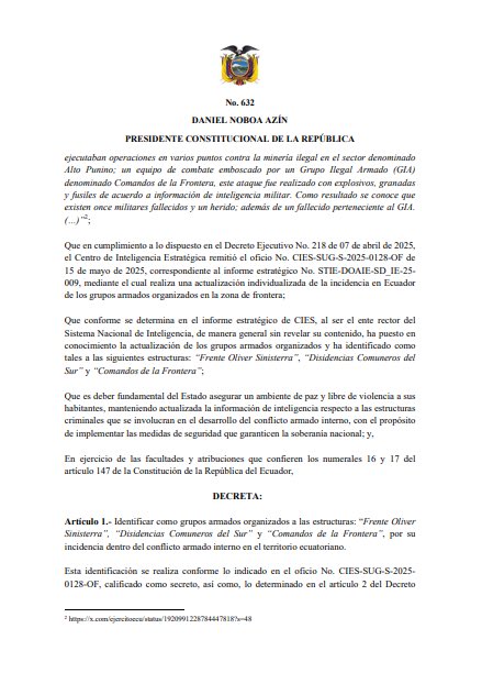Mediante el Decreto Ejecutivo 632, el presidente Daniel Noboa declaró oficialmente como grupos armados organizados a tres estructuras criminales vinculadas a la violencia en la frontera norte del Ecuador. Las organizaciones señaladas son el Frente Oliver Sinisterra, Disidencias Comuneros del Sur y Comandos de la Frontera.